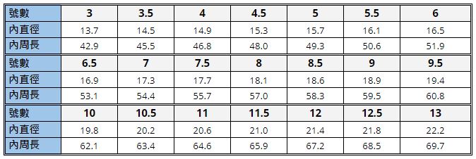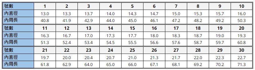 這個超簡單不用多說,測量內直徑後對照尺寸表選擇號數即可。